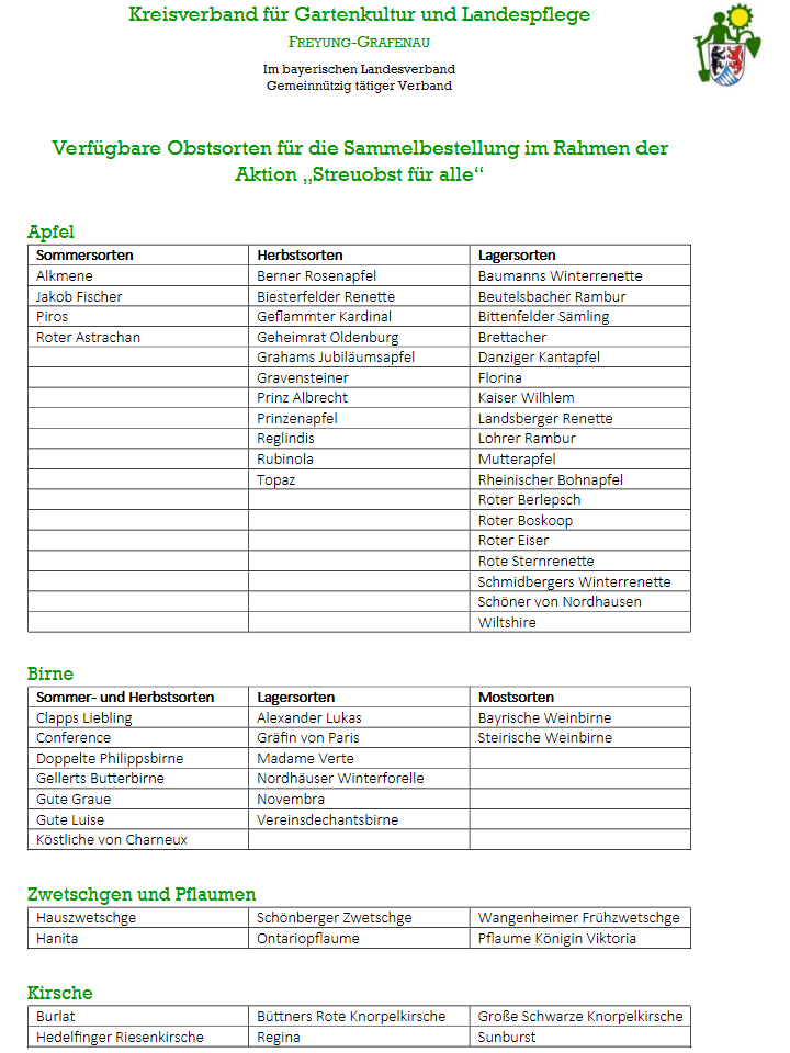 Der Obst- und Gartenbauverein Schiefweg führt ab Juni unter Angabe von Name, Adresse, Flurnummer (außerorts) und Sortenwünsche an alexandramager16@gmail.com eine Sammelbestellung durch. Nichtvereinsmitglieder werden um eine Spende von mindestens 20 € auf das Konto IBAN DE78 7406 1101 0001 820540 gebeten! Mit dem Geld finanziert der Verein Streuobstwiesenführungen an der Grundschule oder Obstbaum-schnittkurse. Die Bäume werden Mitte Oktober geliefert und sollen da gepflanzt werden.